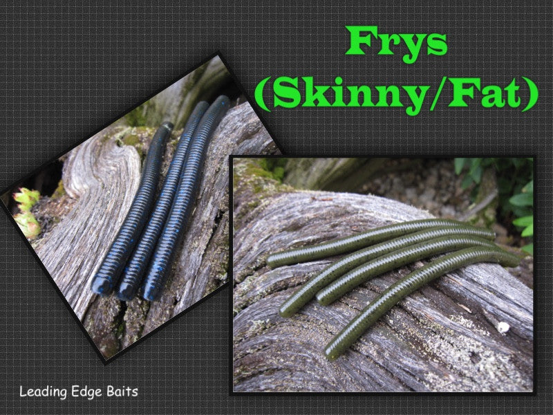 You have the choice between a Skinny or fat version. Whether you Wacky Rig them or drop shot them, our custom Frys catch fish! Loaded with salt for the perfect fall rate and the scent of your choice. This bait is GREAT on a FLICK SHAKE rig. Bait measures 4 1/2" long and is sold in packs of 25 or 100.