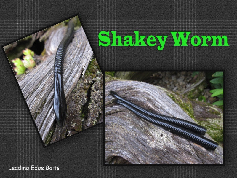 You won't find these anywhere else but here! These baits were custom designed to be fished on a shakey head. This bait is 6" long with deep cut ribs for maximum vibration. The tail is smooth and tapered offering a tantalizing presentation. This bait was designed without a worm sack so it can be shortened to any length without affecting its action. If you're looking for a shakey nobody else is throwing, this is your bait! This bait is a great choice on hot days. Sold in packages of 25 or 100.